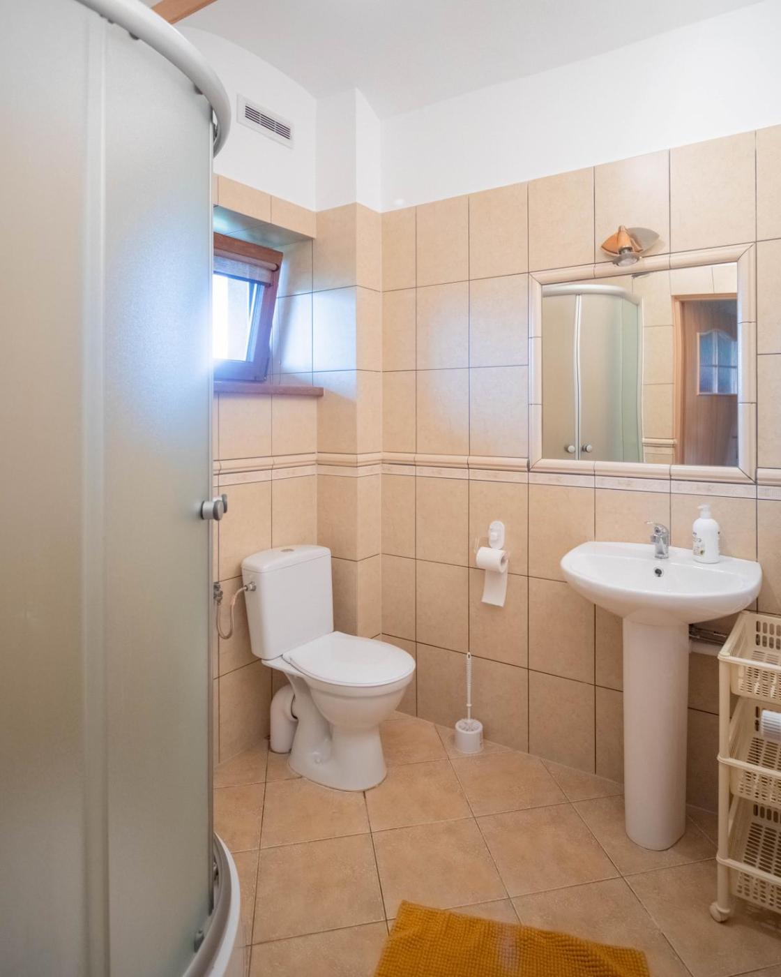 Pokój trzyosobowy z łazienką. Do dyspozycji gości są 2 łóżka. Pokój Trzyosobowy - 3 osobowy.