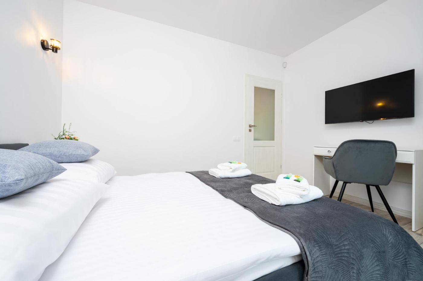 Apartament typu Suite z 2 sypialniami. Boasting a private entrance, this suite comes with 1 living room, 2 separate bedrooms and 1 bathroom with a walk-in shower and a hairdryer. The well-fitted kitchenette has a stovetop, a refrigerator, a dishwasher and kitchenware. Featuring a balcony with garden views, this suite also features a tea and coffee maker and a flat-screen TV. The unit has 4 beds. Apartament typu Suite - 4 osobowy. Powierzchnia pokoju ok.: 50 mkw. ;