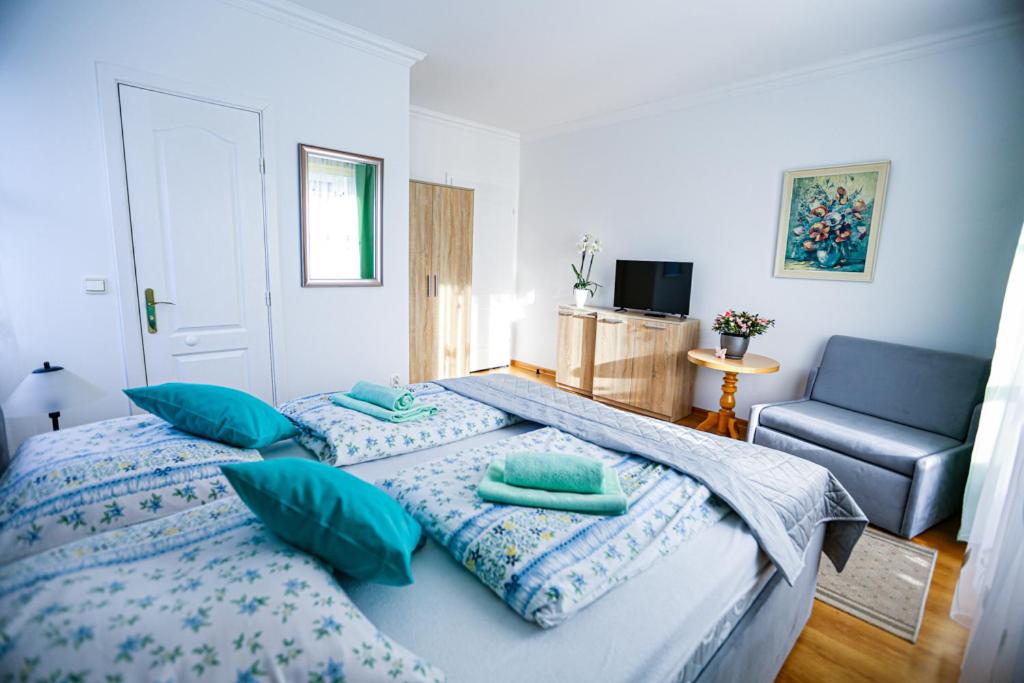 Duży pokój dwuosobowy. Ten pokój dwuosobowy wyposażony jest w telewizor z płaskim ekranem i dostępem do kanałów kablowych. Do dyspozycji Gości jest wspólna łazienka. Ta opcja zakwaterowania zapewnia 1 łóżko. Pokój Dwuosobowy - 2 osobowy. Powierzchnia pokoju ok.: 20 mkw. ;