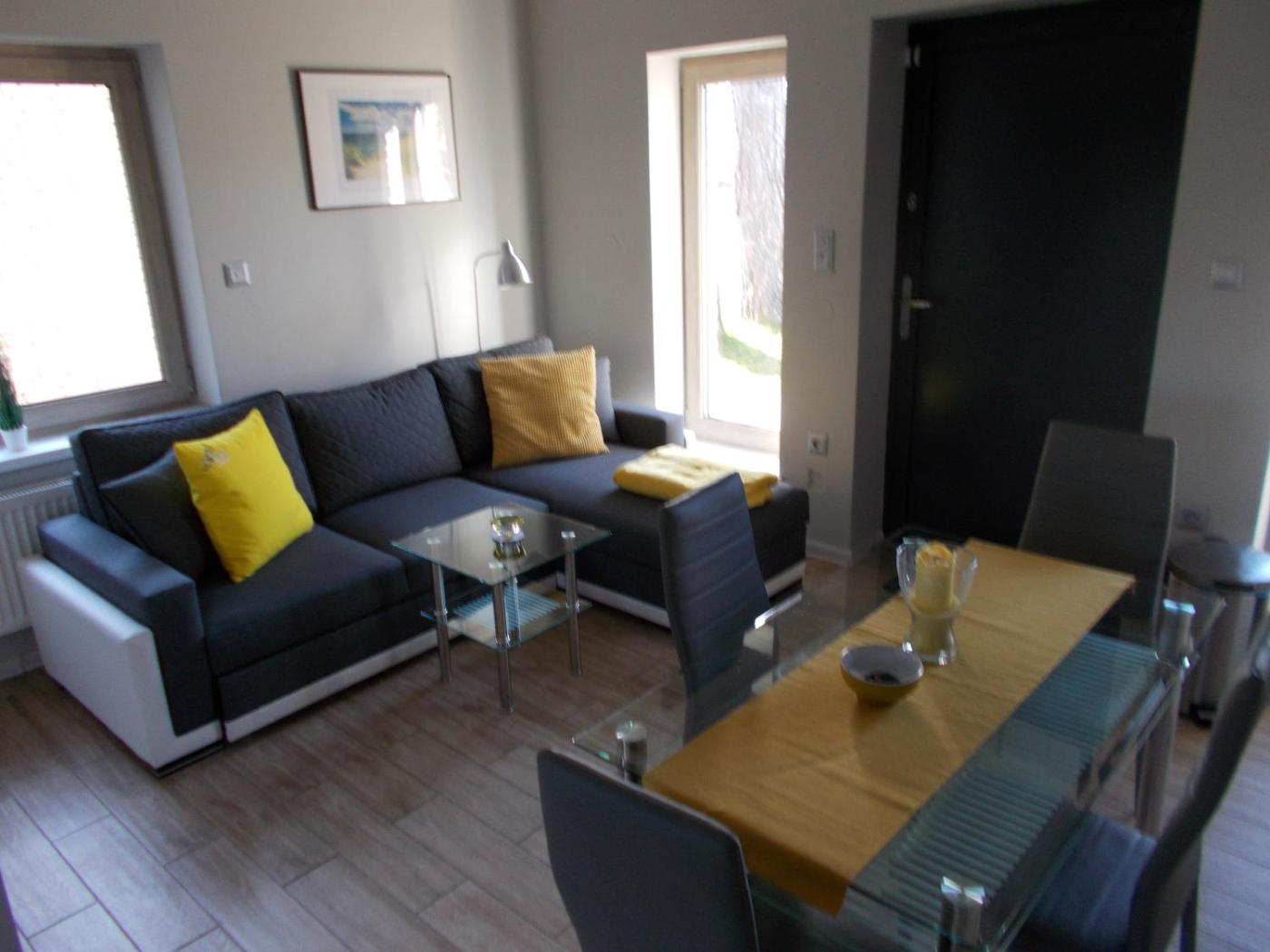 Dom wakacyjny. This holiday homes standout feature is the fireplace. Boasting a private entrance, this holiday home includes 1 living room, 1 separate bedroom and 1 bathroom with a walk-in shower and a hairdryer. Guests will find a stovetop, a refrigerator, a dishwasher and kitchenware in the fully equipped kitchen. The holiday home also features a barbecue. Featuring a terrace with garden views, this holiday home also offers soundproof walls and a flat-screen TV with streaming services. The unit has 2 beds. Dom wakacyjny - 5 osobowy. Powierzchnia pokoju ok.: 30 mkw.